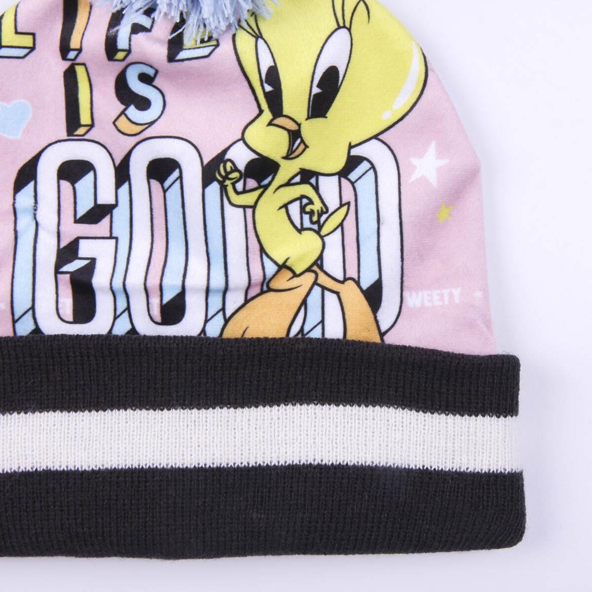 Este encantador conjunto de 3 piezas presenta un diseño de Looney Tunes en tonos rosados, perfecto para los amantes de la diversión y el estilo. La mezcla de 50% acrílico y 50% poliéster garantiza calidez y durabilidad, ideal para los días fríos.