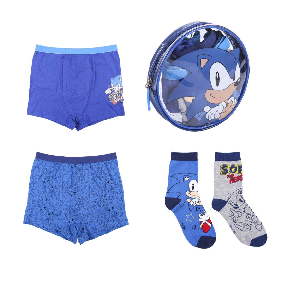 El Pack Boxer + Calcetines 4 Piezas Sonic es el regalo perfecto para los pequeños fans del erizo más rápido del mundo. Incluye 2 boxers y 2 pares de calcetines fabricados en algodón 100% de 145g, ofreciendo suavidad y comodidad durante todo el día. Los diseños en tonos azules y grises con motivos de Sonic aportan un estilo divertido y lleno de energía. Los calcetines cuentan con refuerzo en talón y puntera para mayor durabilidad, y todas las prendas incorporan elásticos para un ajuste perfecto. El pack viene presentado en un práctico neceser redondo con cierre de cremallera, ideal para regalar y reutilizar como organizador o neceser de baño.