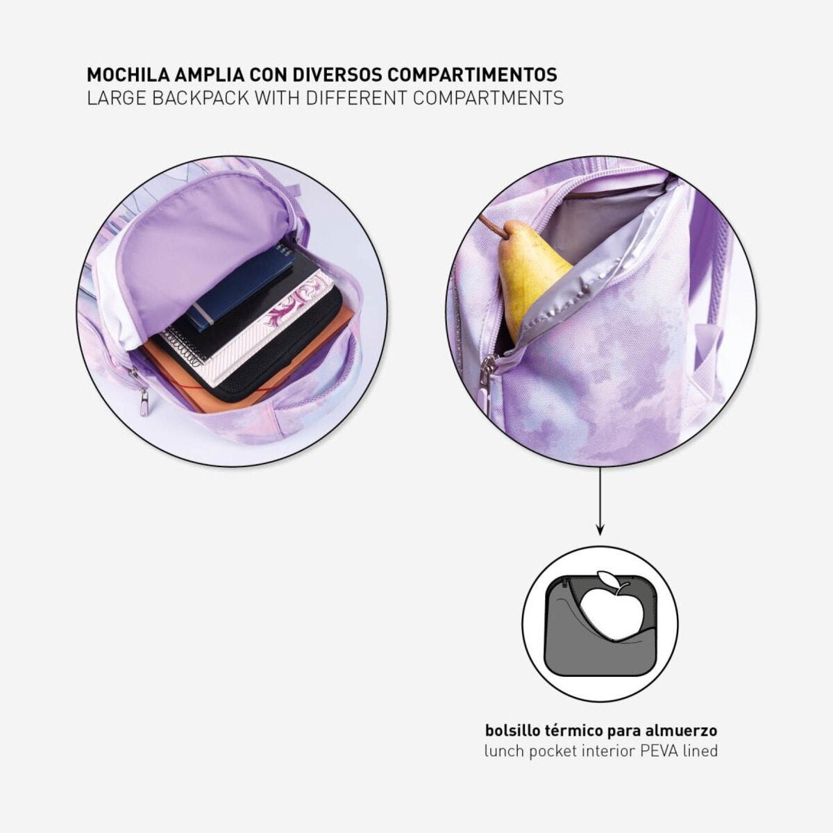 Con medidas de 32.0 x 15.0 x 42.0 cm, ofrece amplia capacidad para libros y cuadernos. Además, cuenta con un práctico bolsillo lateral para botellas o accesorios.